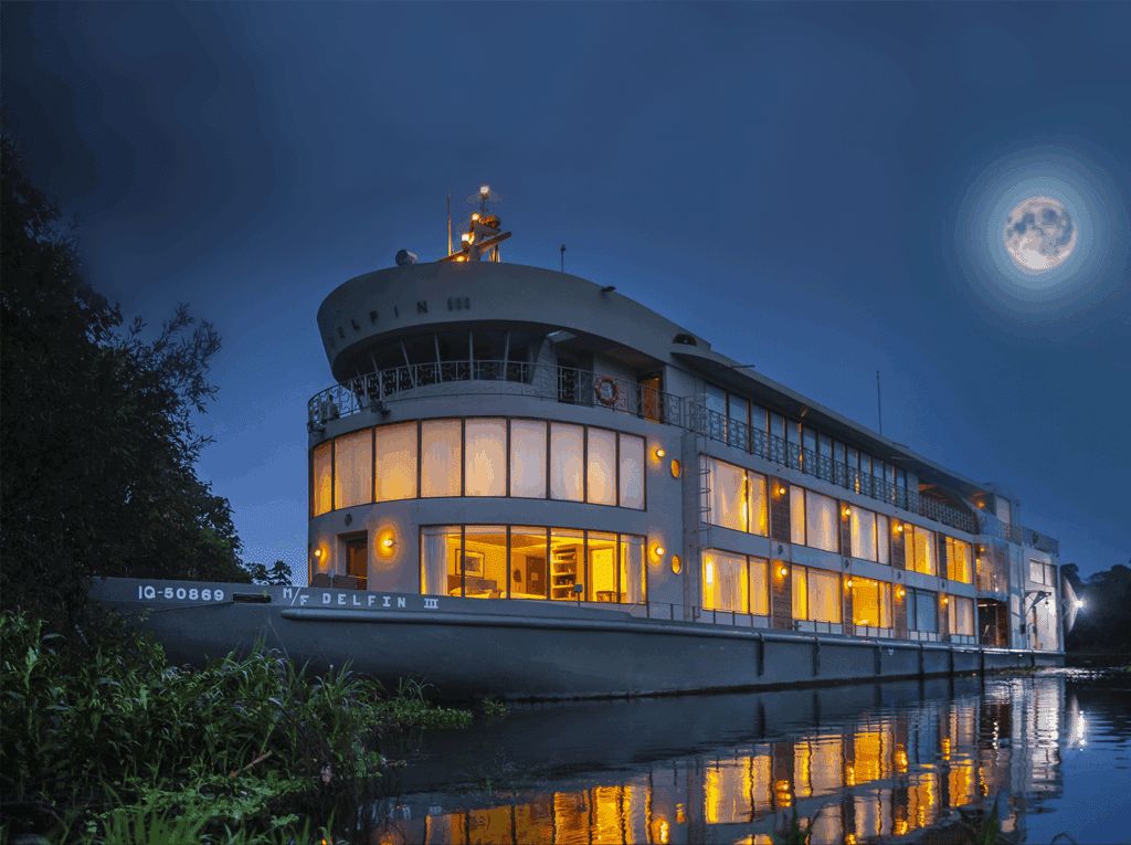 Upon arrival in Iquitos, you’ll be transferred by private vehicle to the port town of Nauta, where your elegant river vessel awaits. As you settle into your suite, enjoy welcome cocktails and a safety briefing before setting off into the lush waterways of the Amazon. As twilight falls, your adventure begins with a magical sunset fishing session for piranhas, followed by a guided night safari. Keep your eyes peeled for caimans, owls, tree frogs, and other nocturnal wildlife under the starlit canopy. It’s the perfect introduction to the wonders of the Peruvian Amazon.