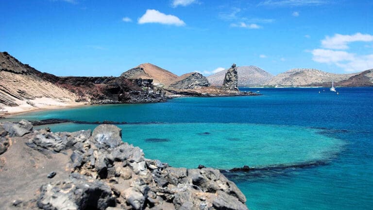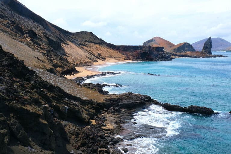 - Bartolomé – This is the place to go for encounters with the famed Galápagos penguin. The gem-shaped rock of Isla Bartolomé is a fragment of the much larger Isla Santiago. Hike a steep trail up wooden stairs to get sweeping views of the penguin-speckled beaches.